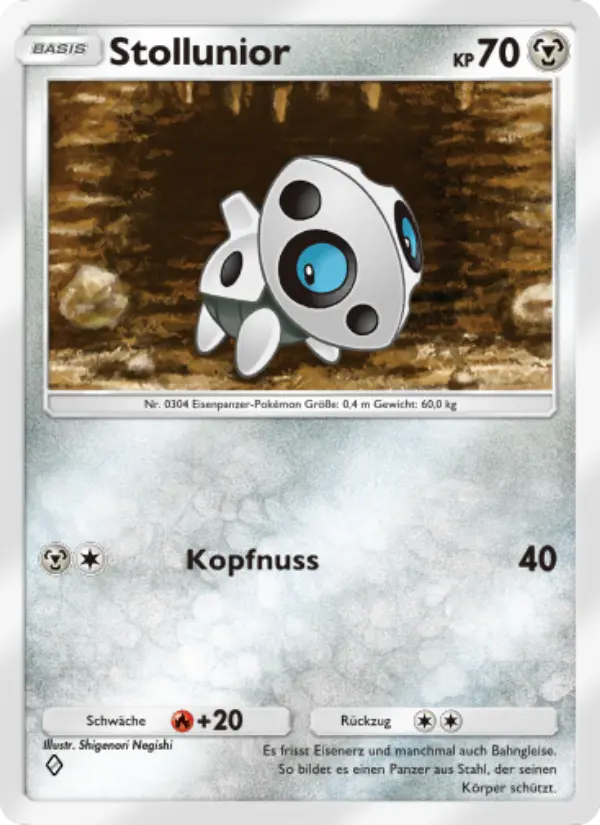 Aron ist eine Pokemon-Karte aus dem Set Extradimensional Crisis. mit 70 KP, Typ: Metall. Es frisst Eisenerz – und manchmal auch Eisenbahnschienen – um die Stahlpanzerung aufzubauen, die seinen Körper schützt.
