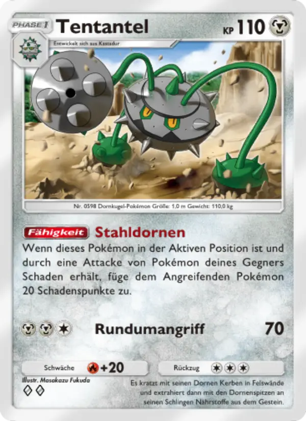 Ferrothorn ist eine Pokemon-Karte aus dem Set Extradimensional Crisis. mit 110 KP, Typ: Metall, Entwickelt sich aus: Ferroseed. Dieses Pokémon kratzt mit seinen Stacheln über Steine, und nutzt dann die Spitzen seiner Fühler zum Absorbieren die Nährstoffe, die es im Stein findet.