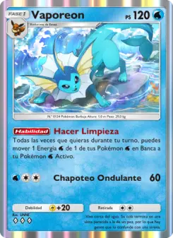 Vaporeon es una carta de Pokemon del set La Isla Singular. con 120 PS, Tipo: Agua, Evoluciona de: Eevee. Vive cerca del agua. Su cola termina en una aleta parecida a la de un pez, por lo que hay gente que lo confunde con una sirena.