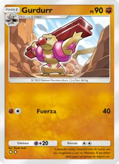 Conkeldurr es una carta de Pokemon del set Guardianes Celestiales. con 150 PS, Tipo: Lucha, Evoluciona de: Gurdurr. El hormigón que preparan los Conkeldurr es mucho más duro y resistente que el ordinario, aunque la composición sea la misma.