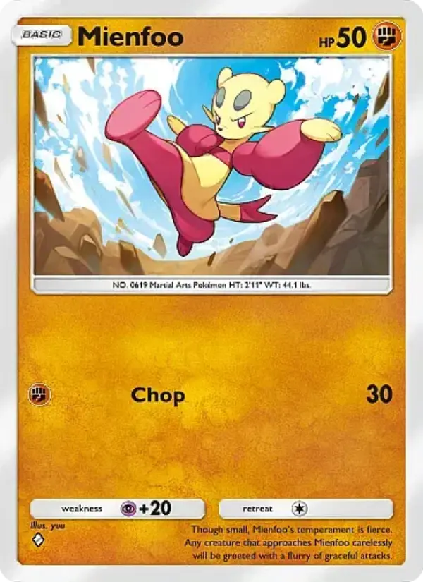 Mienfoo es una carta de Pokemon del set Fuego Carmesí. con 50 PS, Tipo: Lucha. Aunque pequeño, el temperamento de Mienfoo es feroz. Cualquier criatura que se acerque a Mienfoo descuidadamente. será recibido con una ráfaga de elegantes ataques.