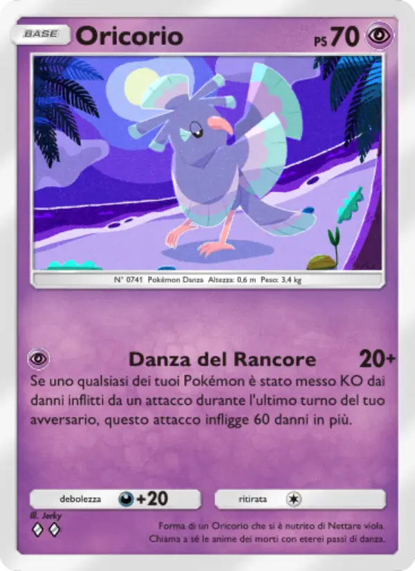 Oricorio è una carta Pokemon del set Guardiani Astrali. con 70 PS, Tipo: Psico. Forma di un Oricorio che si è nutrito di Nettare viola. Chiama a sé le anime dei morti con eterei passi di danza.