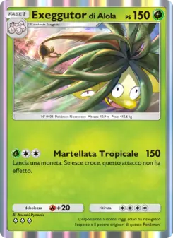 Exeggutordi Alola è una carta Pokemon del set Guardiani Astrali. con 150 PS, Tipo: Erba, Si evolve da: Exeggcute. L'esposizione a intensi raggi solari ha risvegliato l'aspetto e il potere originari di questo Pokémon.